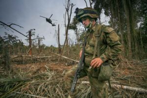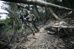 Soldados del Ejército colombiano inspecciona el terreno luego de un bombardeo hoy, 25 de julio de 2009, en Puerto Rico, departamento del Meta Colombia. Al menos 16 guerrilleros de las Fuerzas Armadas Revolucionarias de Colombia (FARC), entre ellos dos jefes de un frente, resultaron muertos. FOTO DAVID OSORIO/EL TIEMPO